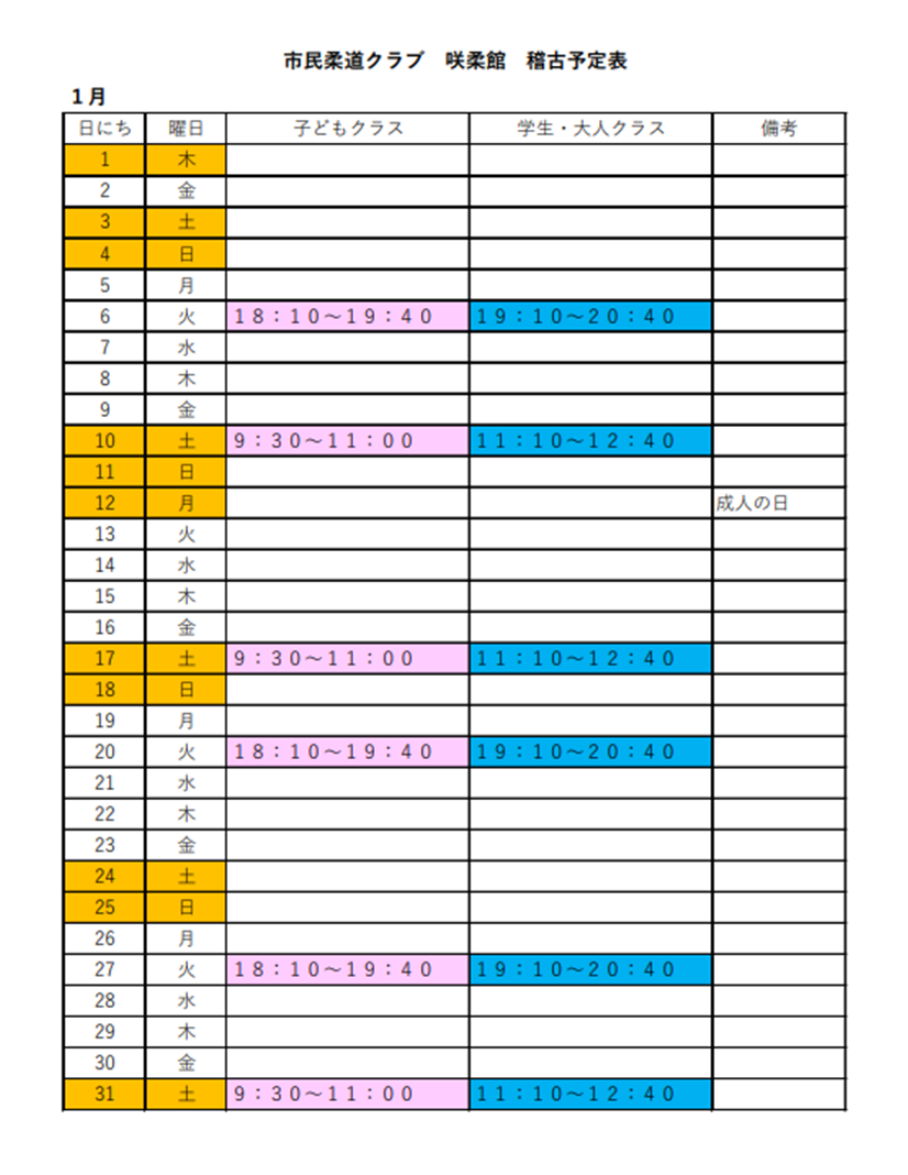 1月の稽古日に一部変更がございますので、ご確認ください。